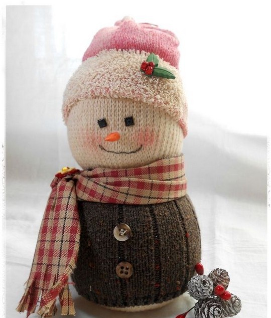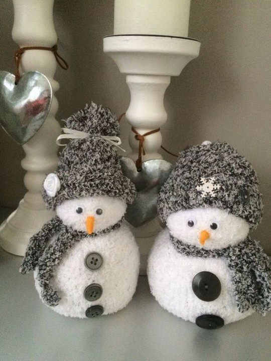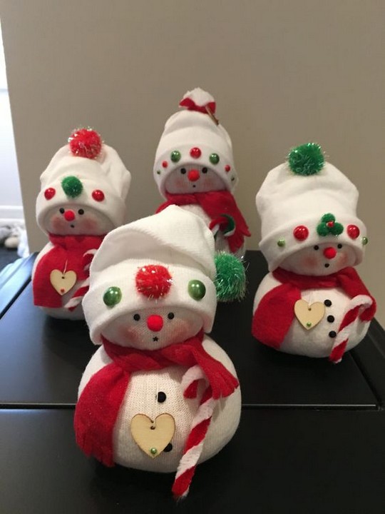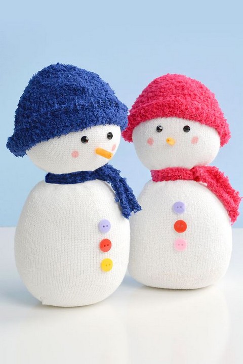 These charming sock snowmen are wonderful. The combination of white socks and stripes are perfect unity. Then add floral and round buttons on it.