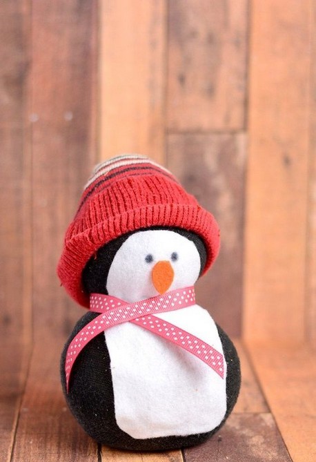 This snowman using two different sock, black-blue stripes and white sock. It looks so cute when you put a star on the hat and put ‘SNOW’ on it. This sock snowman can be a home decoration.
