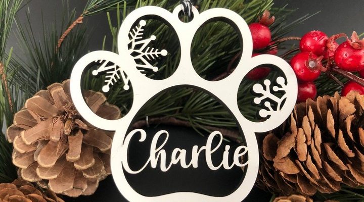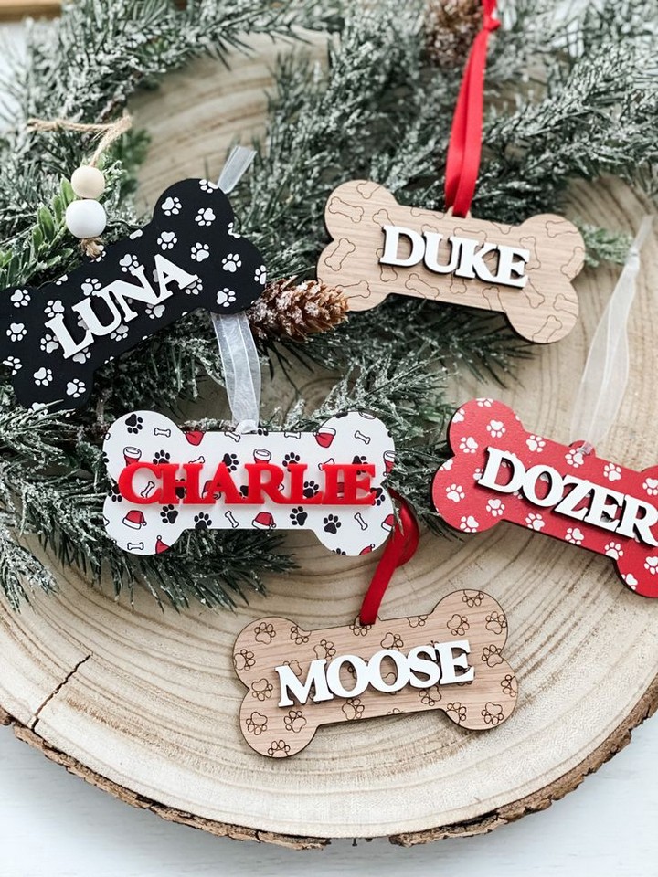 By using bone and then making a puppy paw print on it it will be very gorgeous. Not many people have this ornament. You can make it by yourself or buy it at the store. With any kind of colors and also give them the name on it.
