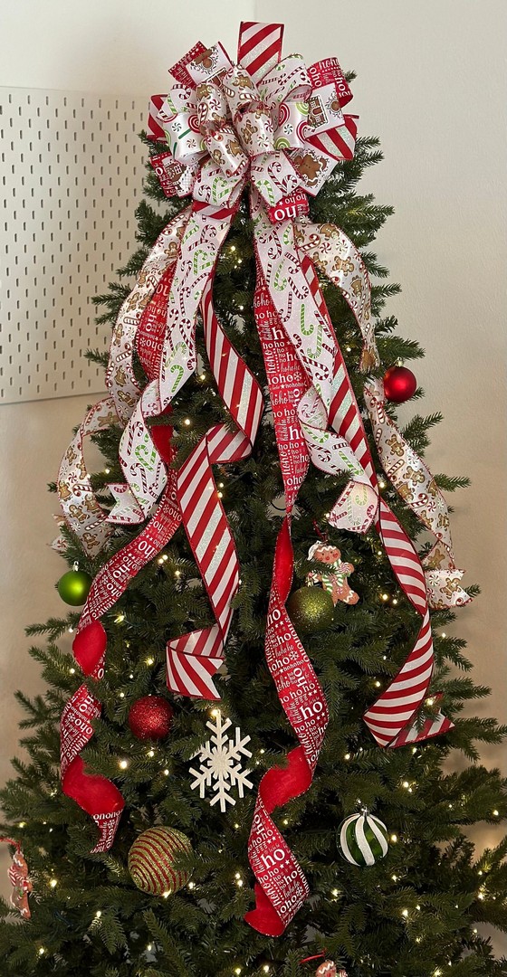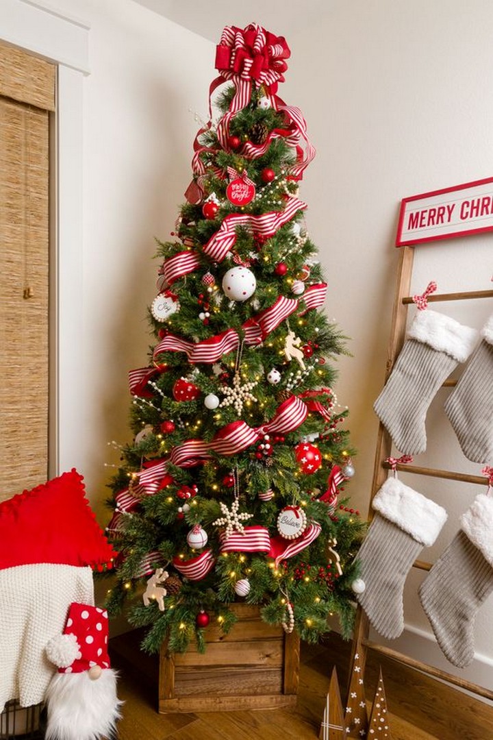 Make a charming tree decoration using this red bow. It’s beautiful. The white polka dot pattern and red color are the perfect combinations for your tree. Put on the topper of the tree.