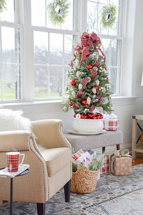 Incorporate a plaid pattern featuring red, green, and white. This classic pattern can be used in various elements such as pillows, throws, or tablecloths for a cozy, cabin-inspired look.
