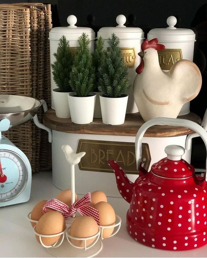 Going back to farmhouse style. Most of the people are very interested in this style. Use baskets that are very chic and stain them with rosy or pink color. Furthermore, you can fill it with any kind of thing like a recipe book, mug, spoon, or cookie. To complete it you can add a natural touch by using flowers.