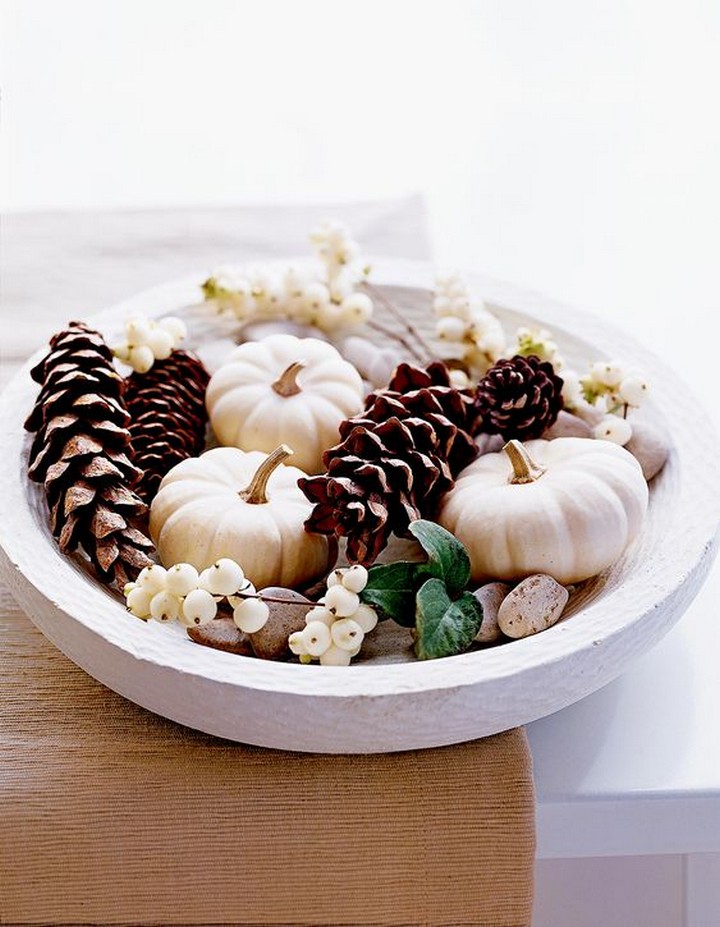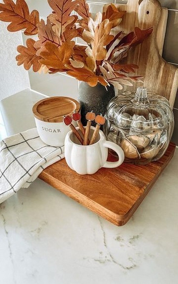 Incorporate small fall-themed decor items like ceramic pumpkins, decorative acorns, or figurines of autumn animals.