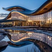Backlighting the wood wall adds another dimension, making it glow from within during evening hours. Visitors experience immediate sensory richness, visual complexity, material warmth, and spatial generosity, all communicated through the simple pairing of glass and wood.