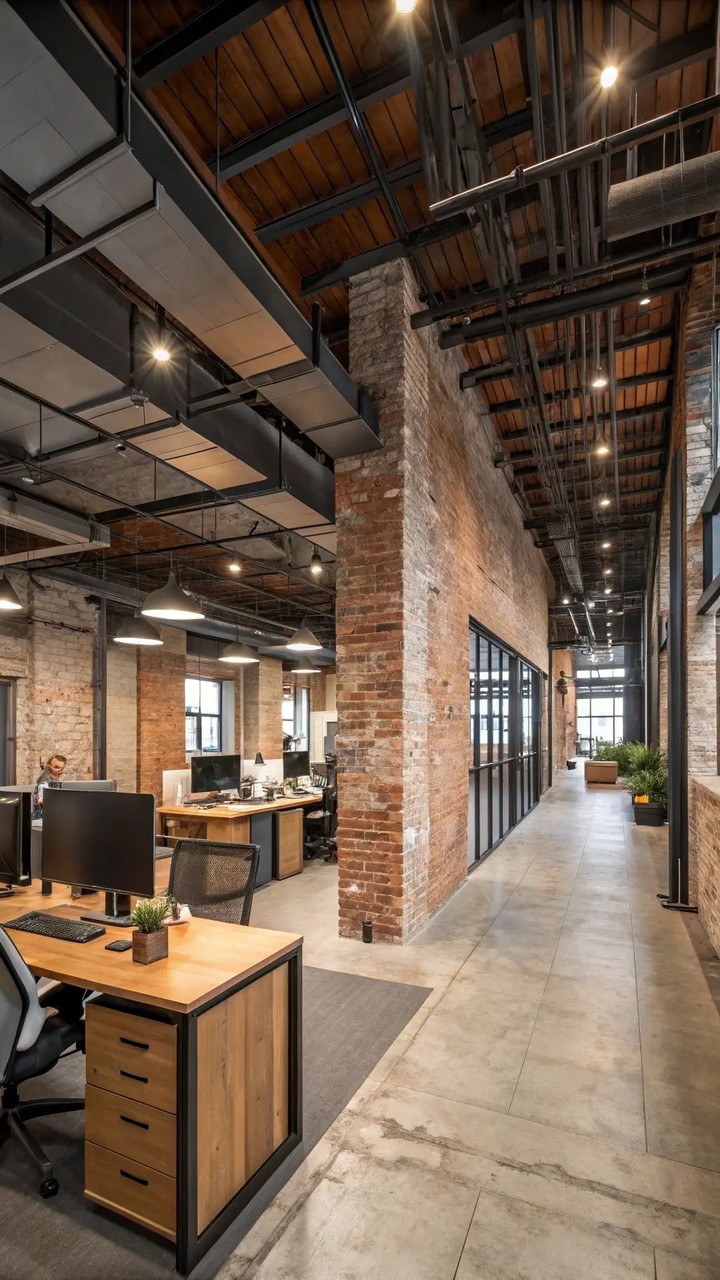Combining exposed brick, glass partitions, and reclaimed wood paneling, this office space captures the startup spirit, innovative, resourceful, and authentic. Floor-to-ceiling glass walls segment areas without disrupting the industrial loft feeling, while weathered wood planks installed horizontally add character and history.