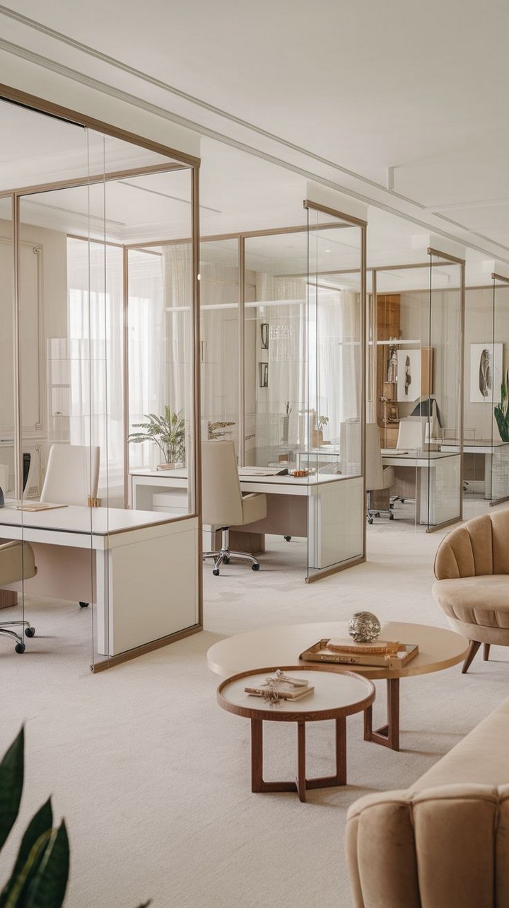 Inspired by Nordic design principles, this office concept features floor-to-ceiling glass partitions paired with light oak paneling that runs vertically along accent walls. The glass divisions maintain visual openness while providing necessary sound dampening for focused work areas. The pale wood tones create a serene atmosphere that embodies the hygge philosophy, comfort, wellness, and contentment.