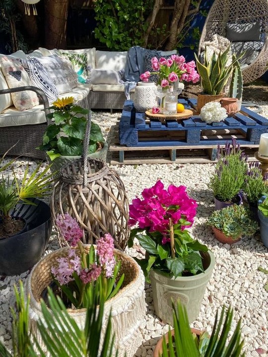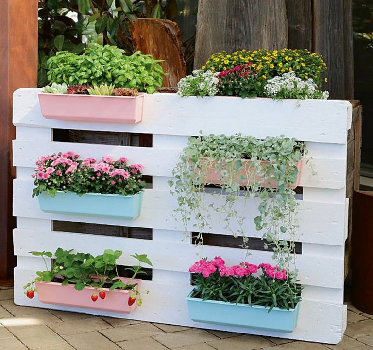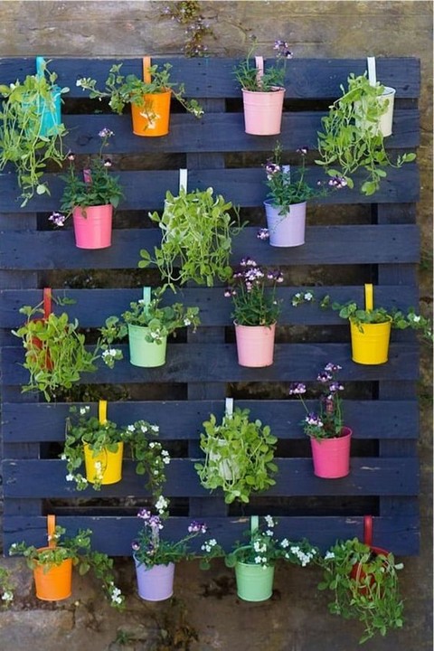 – Plant your choice of flowers or trailing plants in small containers attached to the pallet slats.