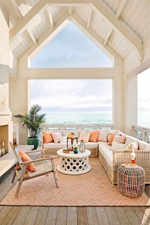 – A welcoming front porch is a must for a coastal farmhouse. Include a comfortable seating area with weathered wood or wicker furniture.