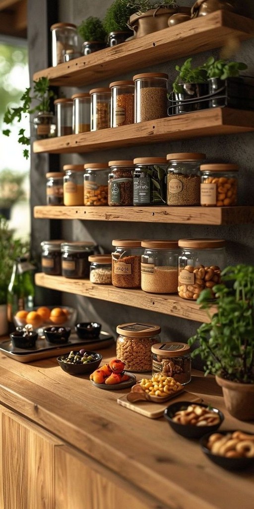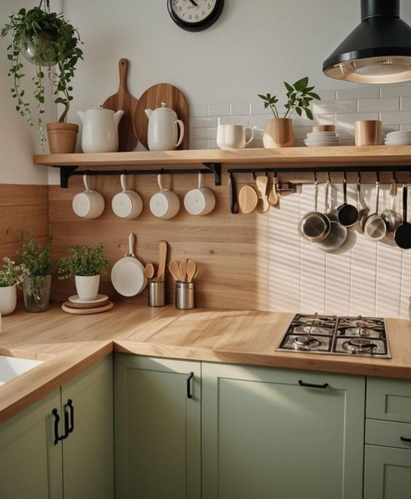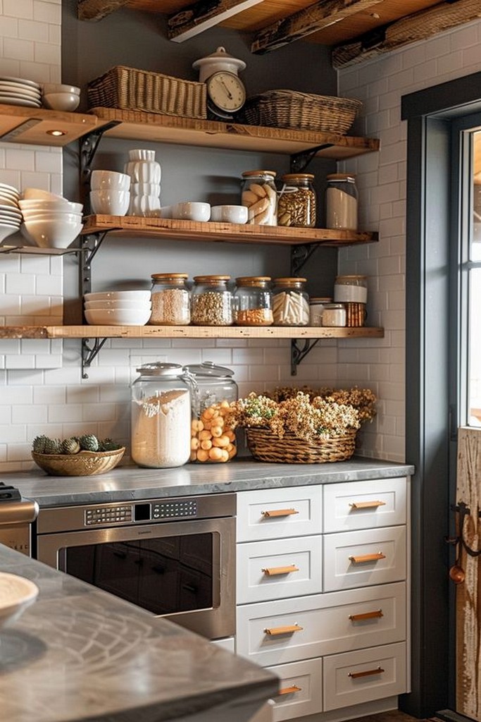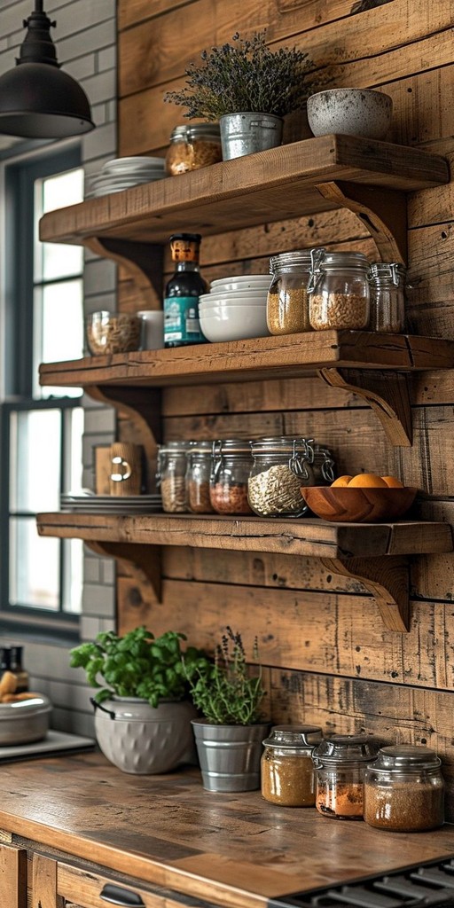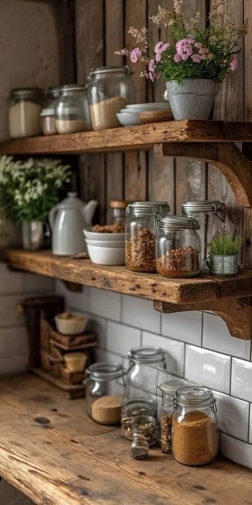 Opt for reclaimed wood shelves for a rustic and eco-friendly vibe. The weathered and aged appearance of reclaimed wood adds character to the kitchen.