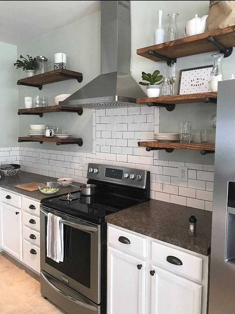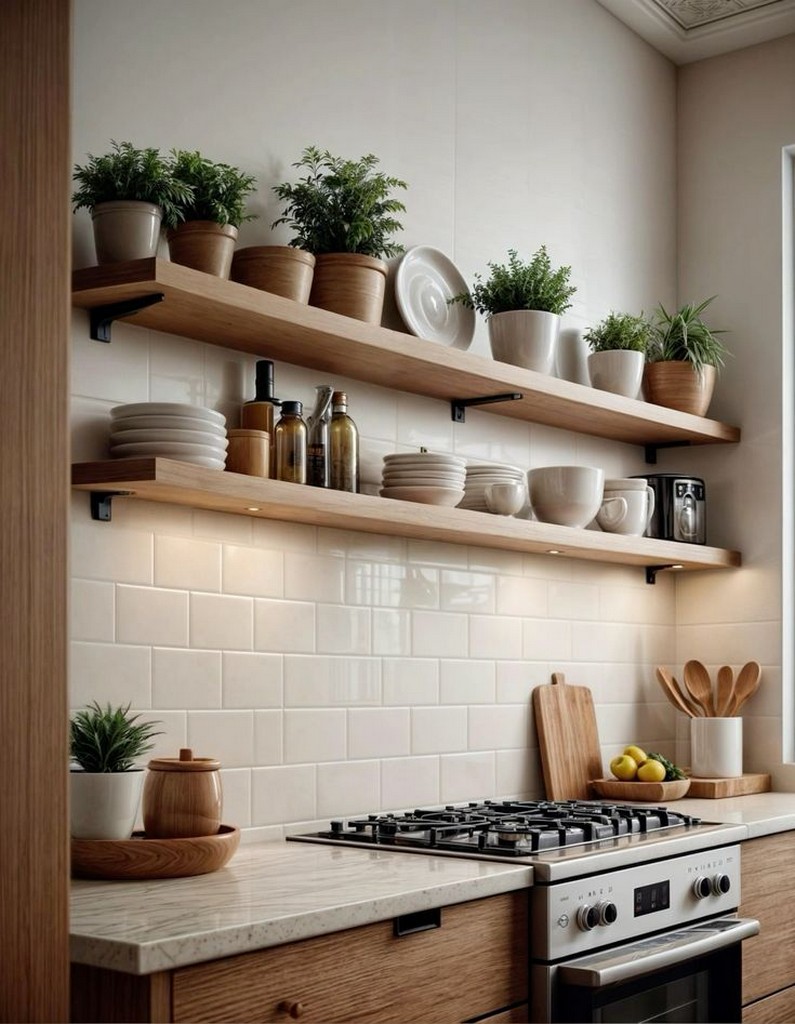 Install white open shelving to create a bright and airy feel. This works well in kitchens with light color schemes and can make the space appear larger.