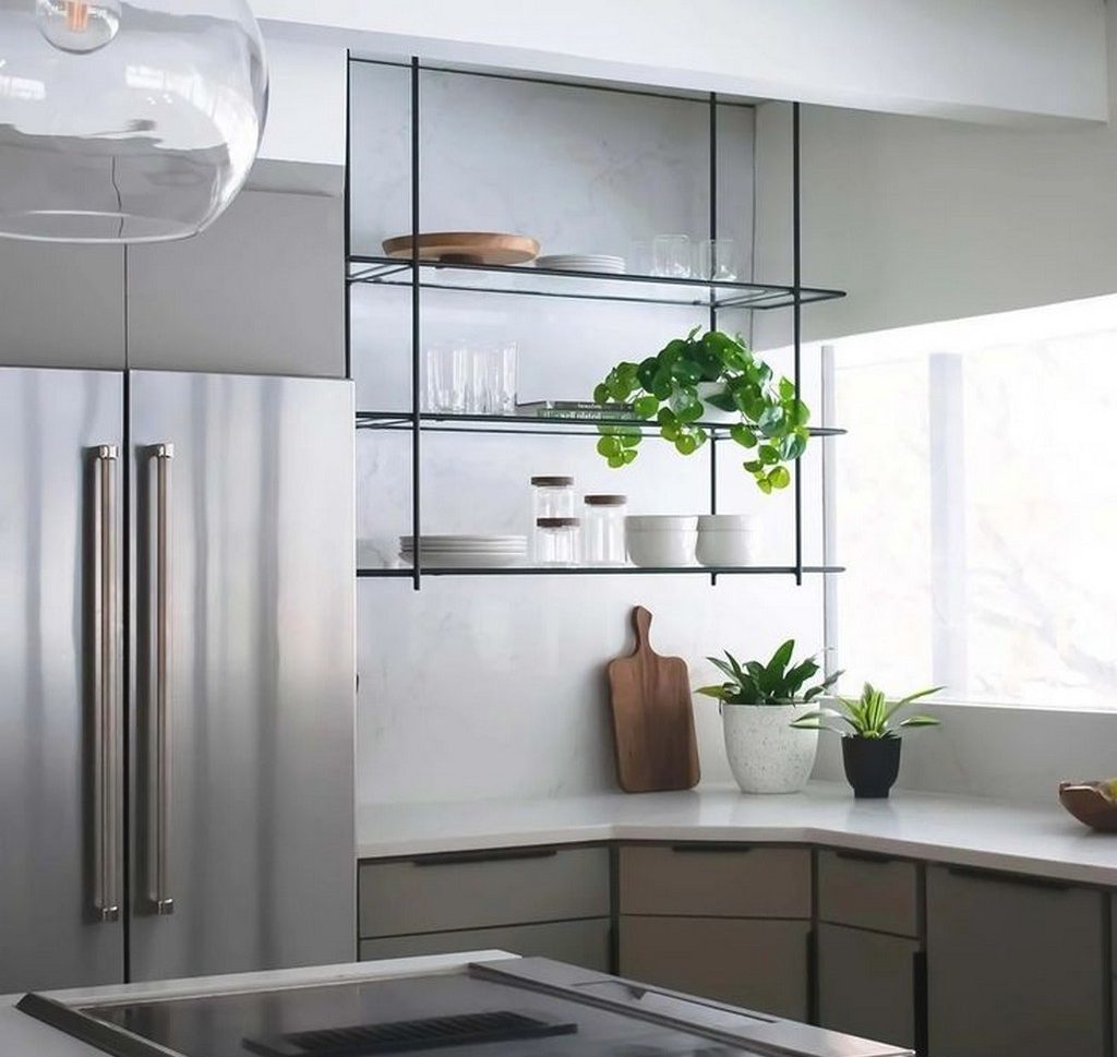 Use glass shelves for a contemporary and sophisticated look. Glass shelves are visually light and can make the kitchen feel more open.