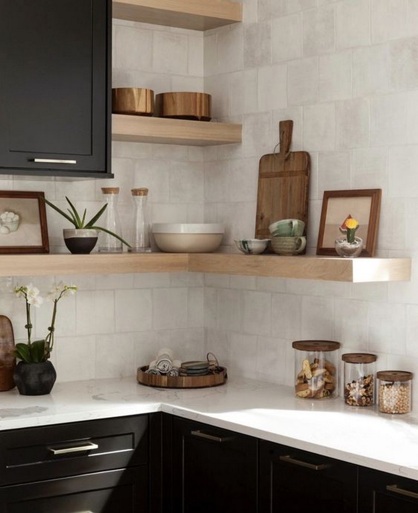 Utilize corner spaces by installing open shelves. This maximizes storage and provides a unique design element in often-underutilized areas.