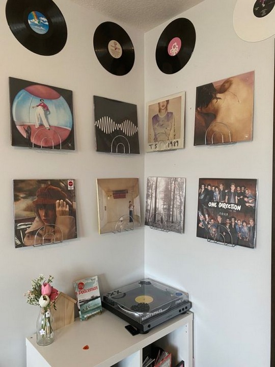 Showcase your vinyl record collection on the accent wall using wall-mounted shelves or custom display racks.