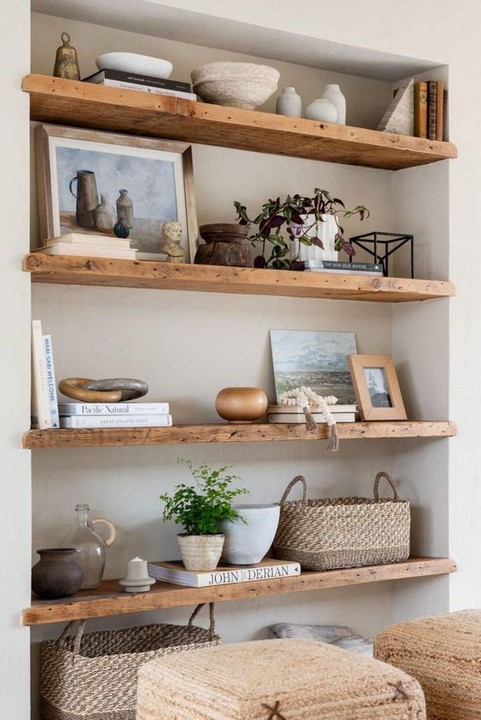 - Install open shelves in your living room, kitchen, or bedroom to display items like books, plants, and decorative objects.