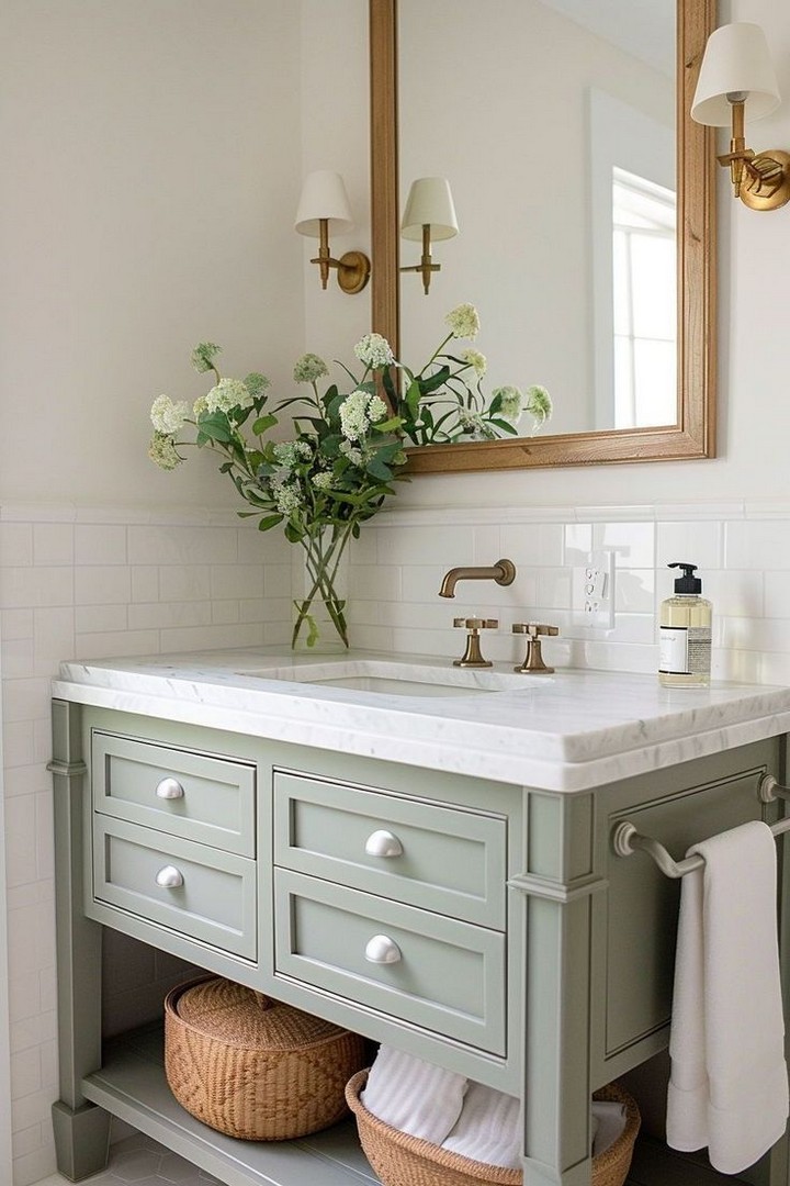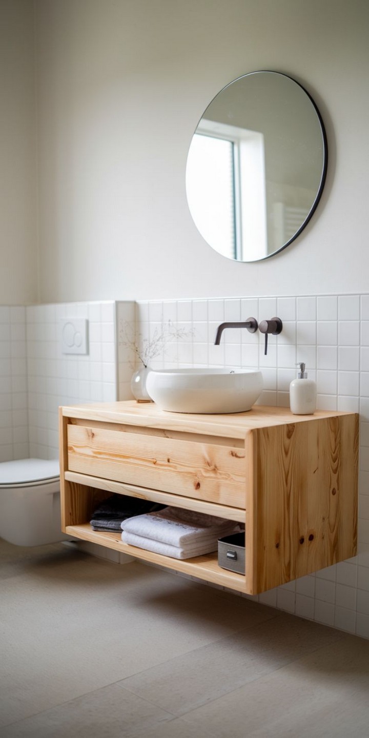 Wall-mounted vanities create the illusion of more floor space by allowing light to flow underneath. This visual trick makes small bathrooms feel significantly larger while providing essential storage above and below.
