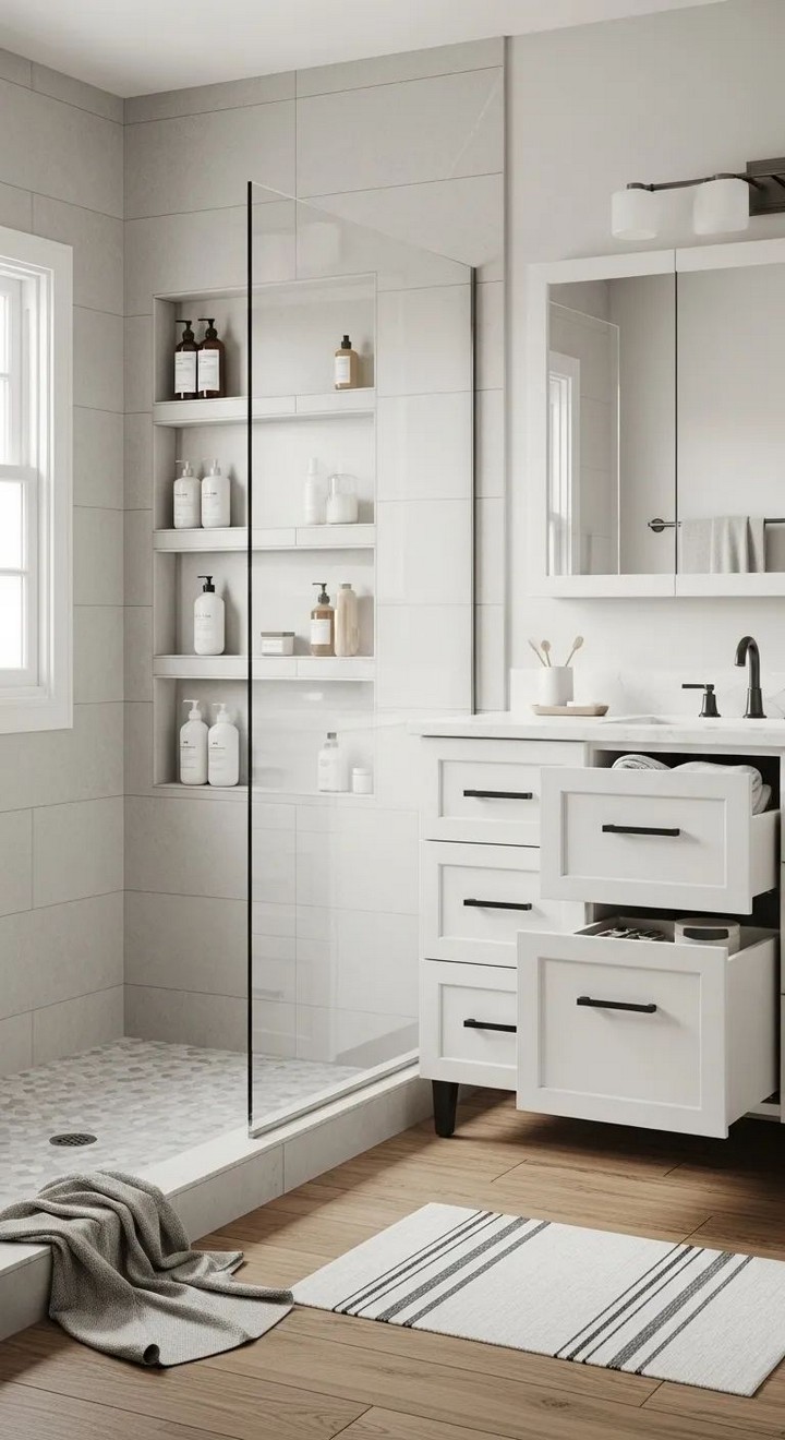 Create a peninsula-style vanity that extends into the room, providing counter space and storage while defining the shower area behind it. This semi-open concept maintains privacy while maximizing functionality.