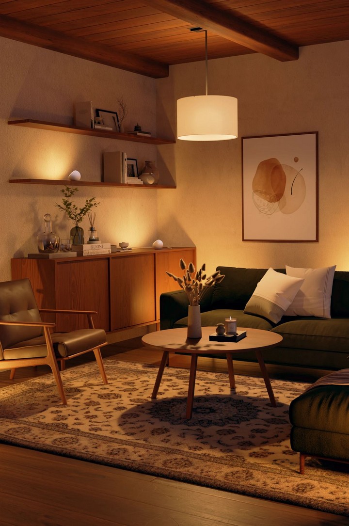 Replace overhead fluorescents with statement pendant lights that serve as both functional lighting and sculptural elements. A single, well-chosen pendant light over a seating area can define the space while providing the warm, ambient lighting essential for coziness. Consider brass or warm-toned metal fixtures that cast a golden glow throughout the room.