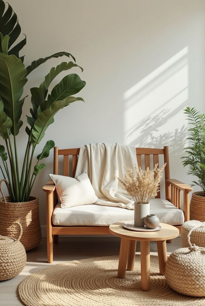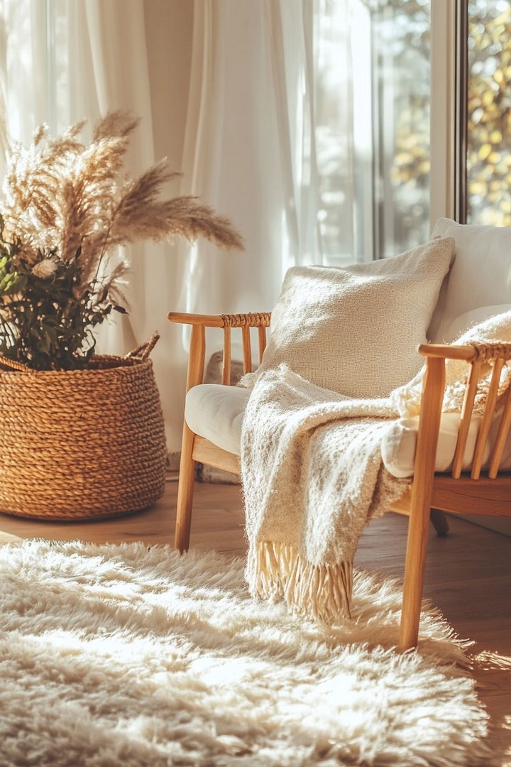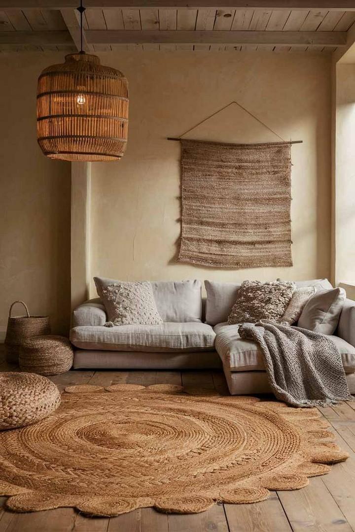 Ground your seating area with a rug made from natural fibers like jute, sisal, or wool. These materials add texture and warmth while maintaining the organic, unprocessed feeling that works so well in minimalist cozy spaces. Choose neutral colors that won’t date quickly.