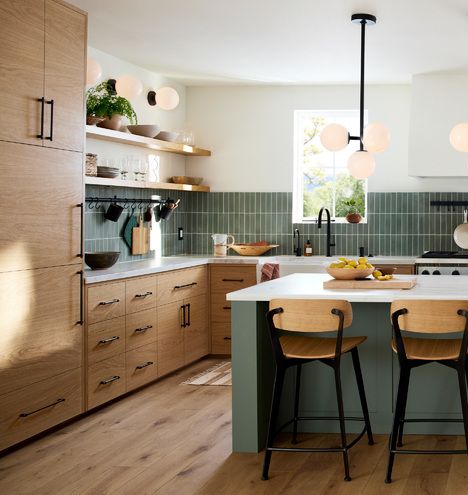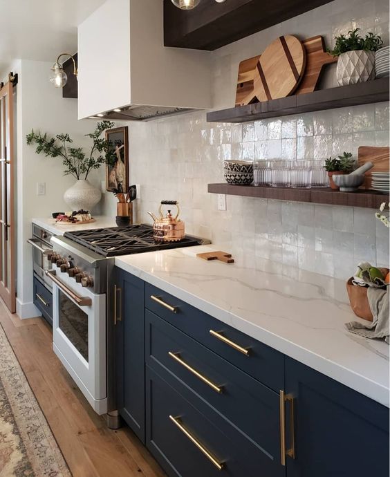 Install an open shelving system in combination with closed cabinets. This allows you to display stylish kitchenware while keeping essentials tucked away.