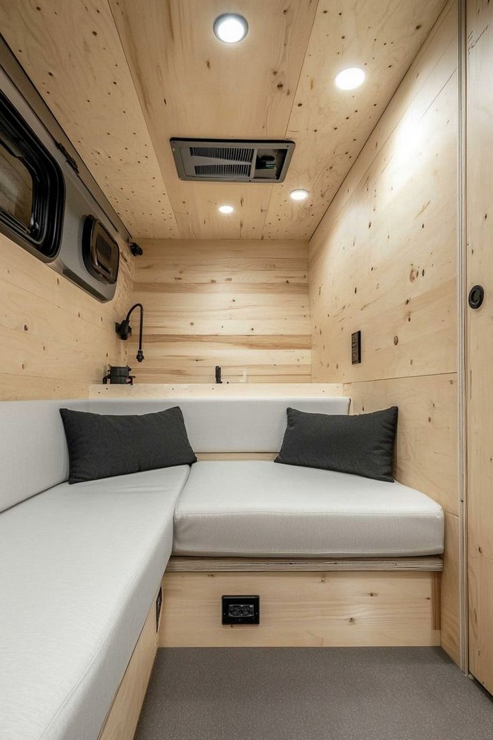 Embrace clean lines, pale woods, and natural lighting with a minimalist Scandinavian aesthetic. These builds create a sense of calm and order—ideal for productivity. Install clever, foldaway furniture and use neutral tones to keep the interior bright and focused.