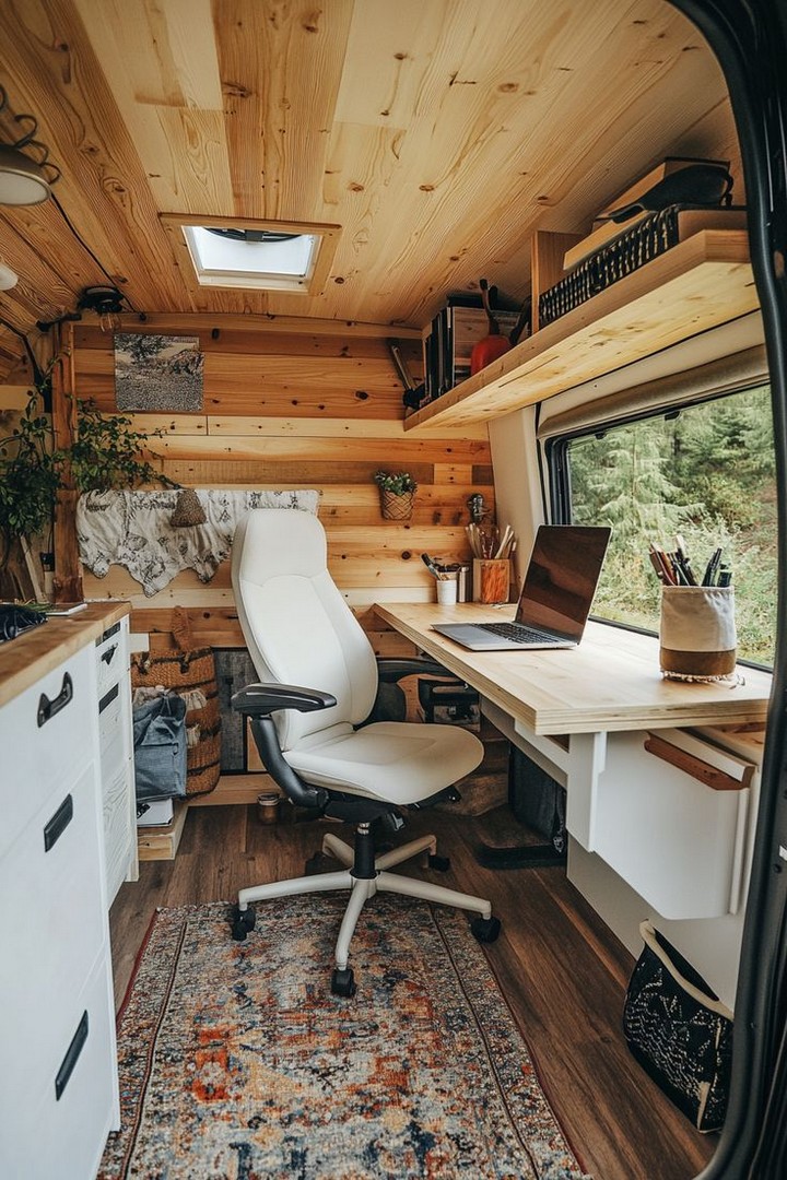 Convert the rear of your van into a dedicated office pod. When parked, slide out a custom-built desk and bench seating from the rear doors. This outdoor-inspired workspace takes full advantage of natural light and airflow while keeping the van’s interior clutter-free.