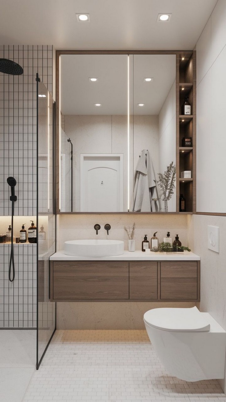 Replace your standard bathroom mirror with a recessed medicine cabinet that doubles as a mirror while providing concealed storage. Modern medicine cabinets offer much more than basic shelving – look for models with adjustable shelves, electrical outlets for charging devices, and LED lighting.