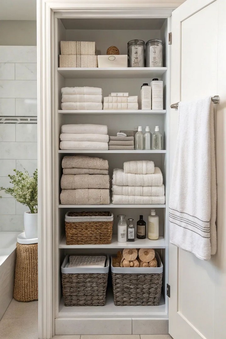 Rolling towels instead of folding them can save up to 30% more space, while designated spots for each type of linen prevent overcrowding and maintain organization.
