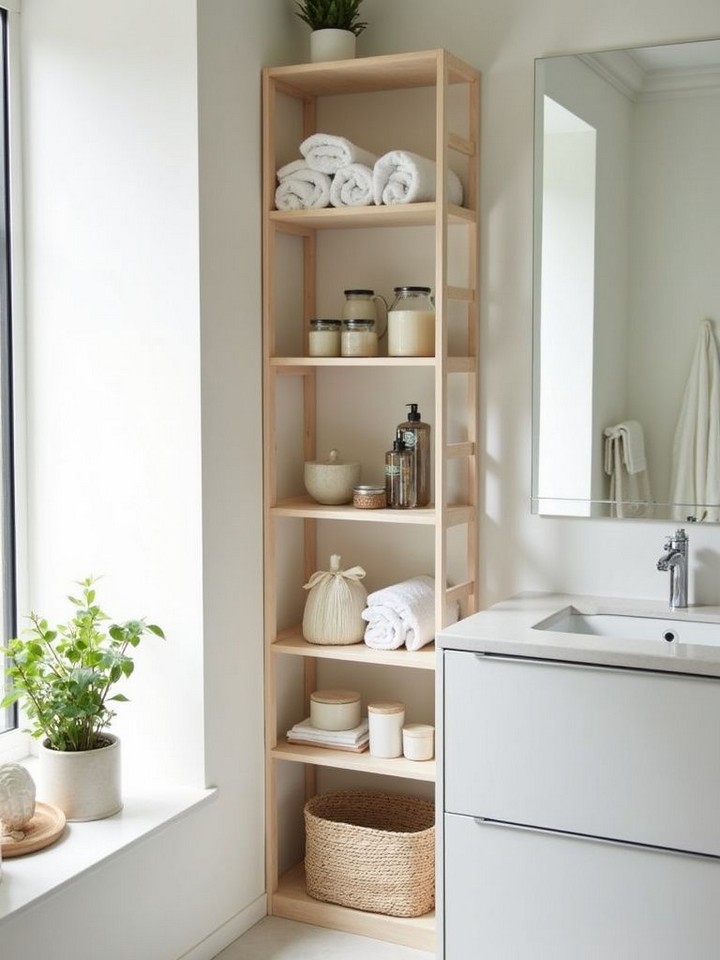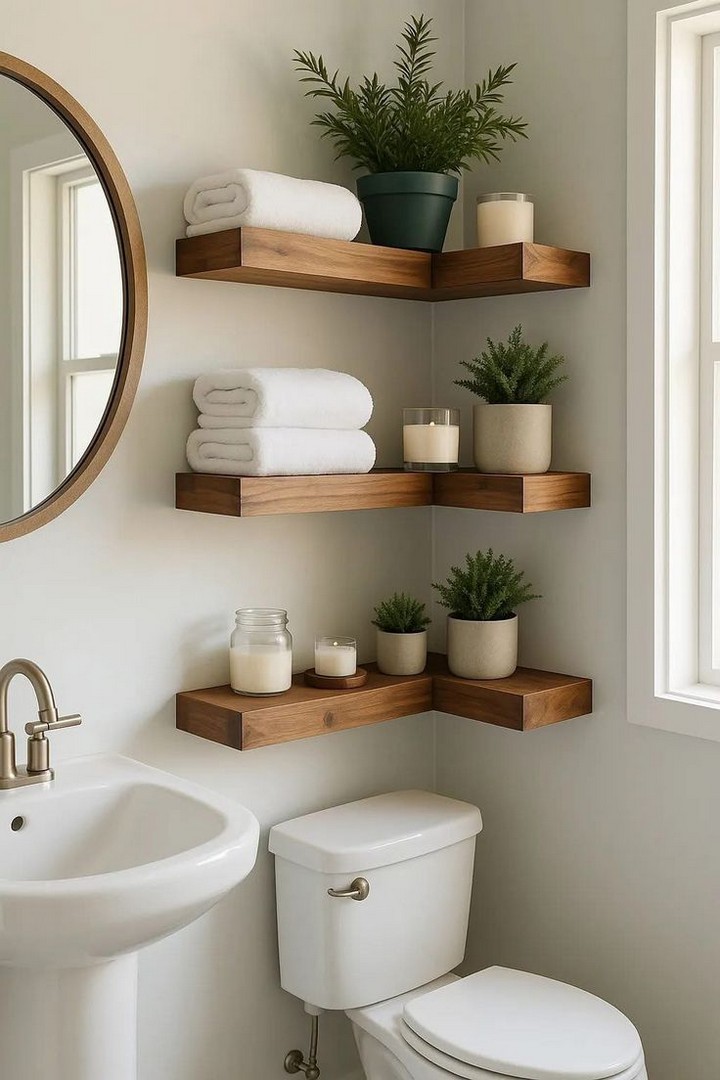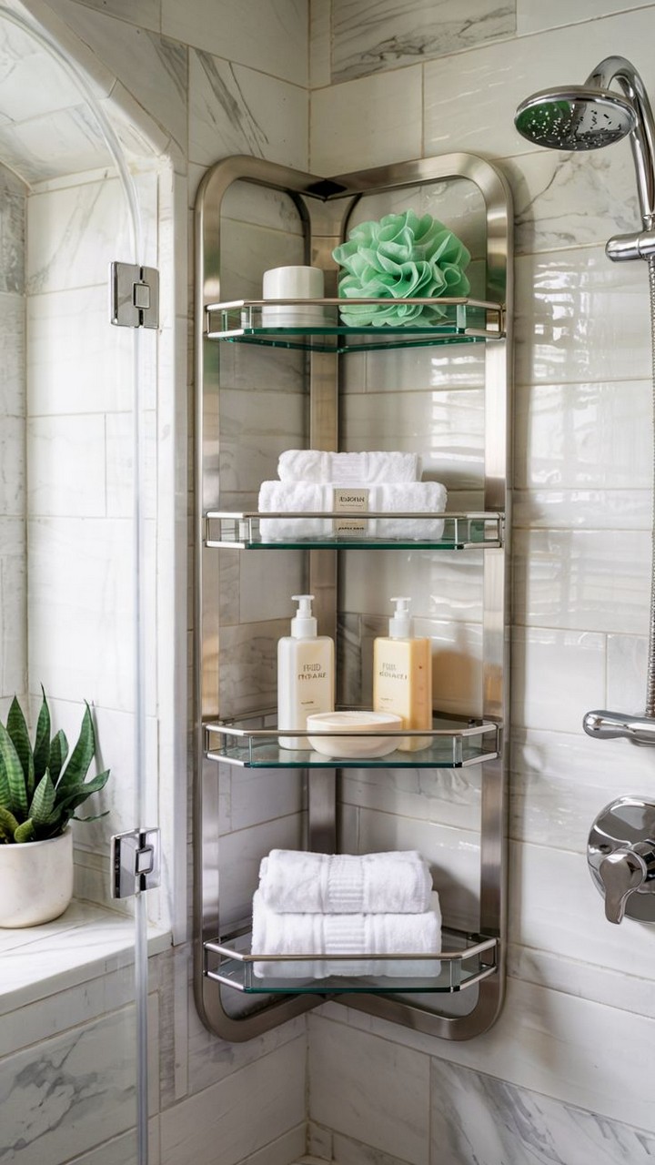 Corners are natural dead spaces that can be transformed into functional storage areas. Install corner shelves, a corner shower caddy, or a tall corner storage tower to make use of these awkward spaces. Triangle-shaped shelves fit perfectly into corners and provide surprising storage capacity for such a small footprint.