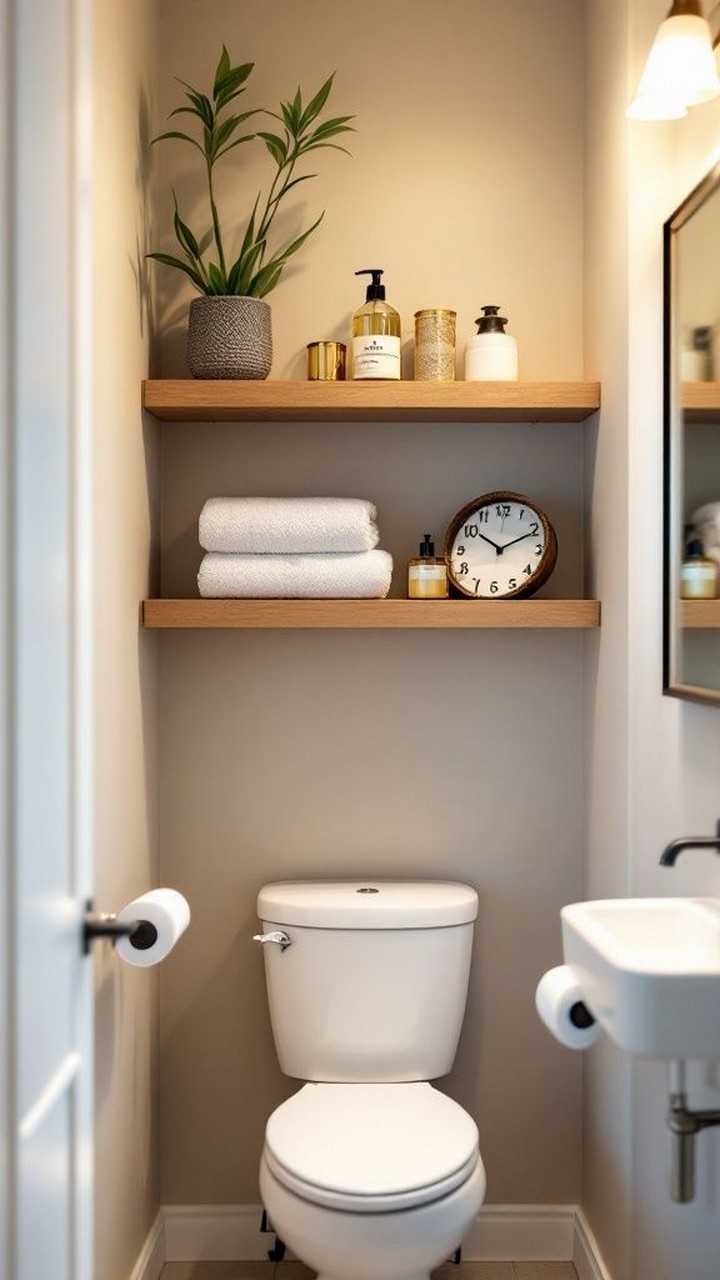 Choose shelves with hidden brackets for a clean, modern look, and consider materials that complement your bathroom’s aesthetic. Glass shelves work particularly well in small spaces as they maintain visual openness while providing functional storage.