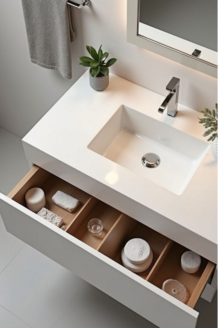 Consider installing a toe-kick drawer beneath your vanity for storing flat items like bath mats, cleaning cloths, or seasonal decorations. This hidden storage solution utilizes space that’s typically wasted.