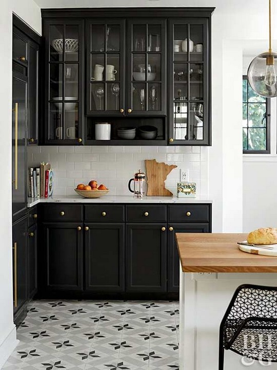 Incorporate glass inserts into some of the black cabinet doors. This not only breaks up the solid black but also adds a touch of transparency.