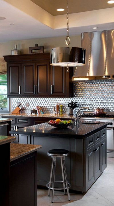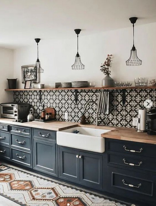 Install patterned tiles as a backsplash to add visual interest to the kitchen. This works particularly well when paired with black cabinets.