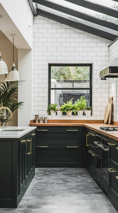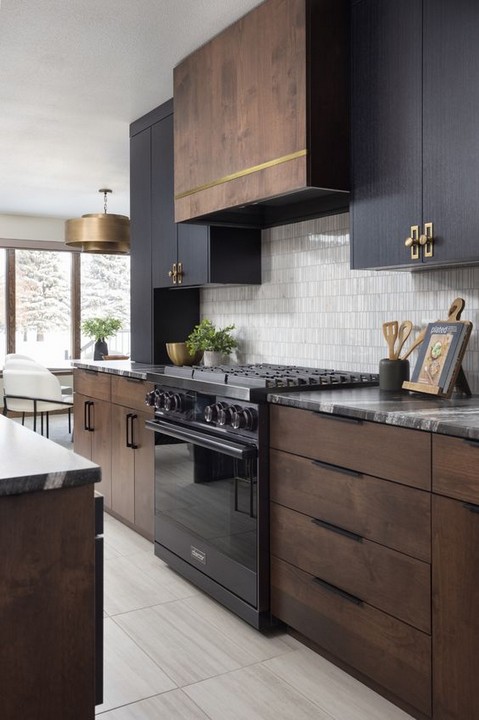 Pair black cabinets with a classic subway tile backsplash for a timeless yet modern look. The white tiles create a beautiful contrast against the black.