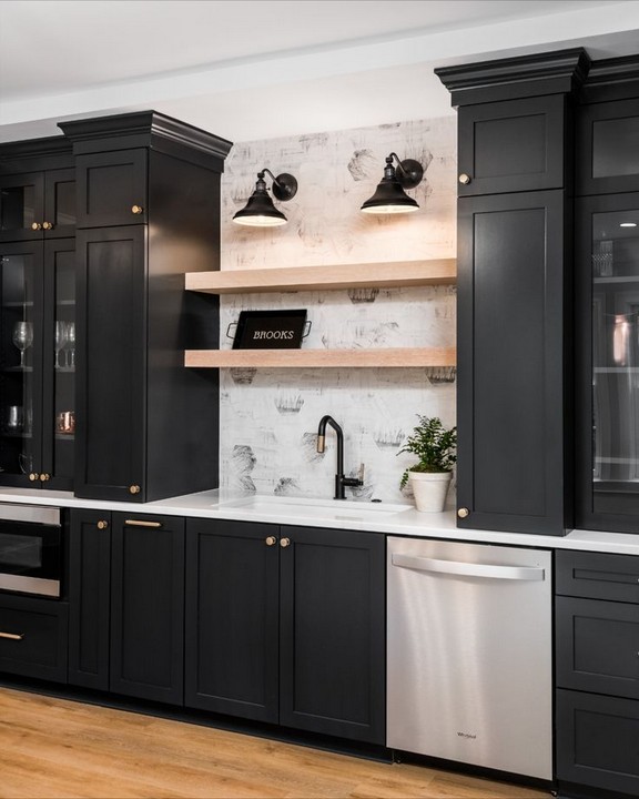 Incorporate open shelving in between black cabinets to break up the darkness and provide a space for displaying stylish kitchenware.
