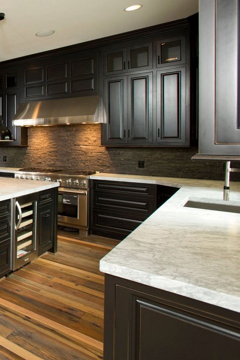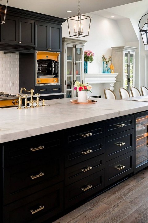 Create a luxurious look by pairing black cabinets with marble countertops. The veining in the marble adds a touch of elegance and breaks up the darkness.