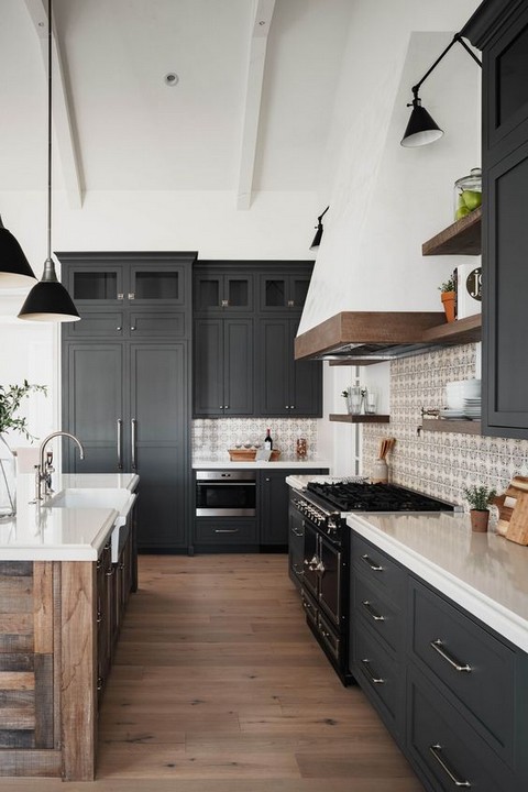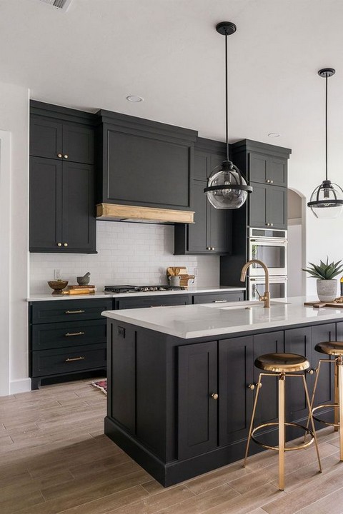 Combine black cabinets with dark wood flooring for a rich and grounded feel. The contrast between the dark cabinets and floors can be visually striking.
