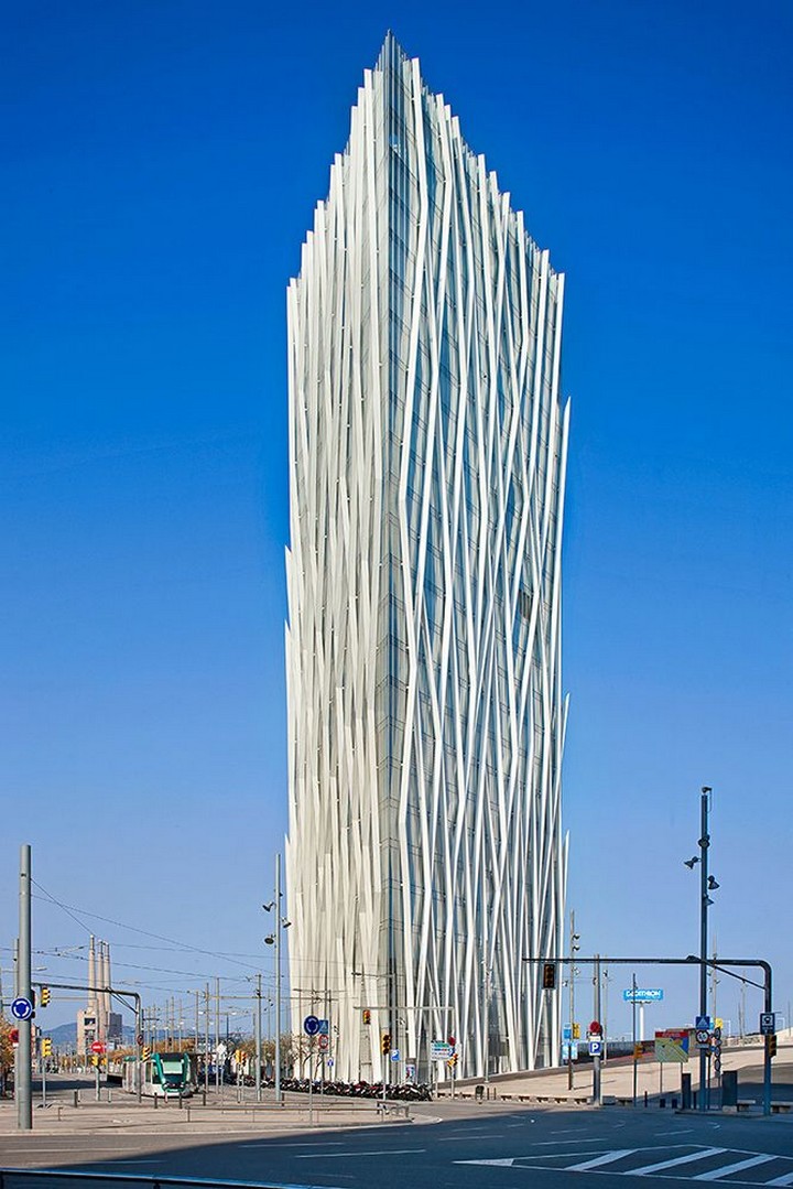 This crystalline tower by EMBA Architects features a distinctive diagonal grid facade that catches light dynamically throughout the day. The building’s innovative structural system allows for column-free interiors with exceptional flexibility. The geometric glass facade creates constantly changing reflections and shadows, making the building appear different from every angle and at every time of day. The design responds to Barcelona’s climate with sun-shading systems integrated into the facade that reduce solar gain while maintaining transparency.