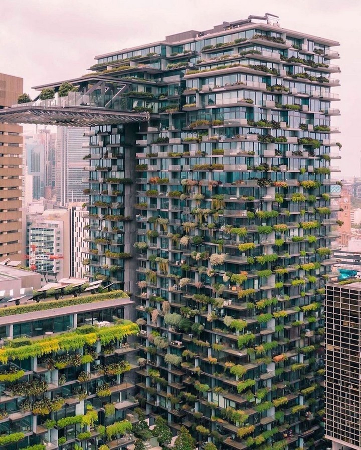 Jean Nouvel’s One Central Park features the world’s tallest vertical garden, designed by botanist Patrick Blanc, covering the building’s facade. The living wall contains 35,200 plants from 383 species, creating a constantly evolving biological artwork. A cantilevered heliostat reflects sunlight into shadowed areas of the vertical garden and adjacent public spaces. This integration of architecture, nature, and innovative engineering creates a building that actively contributes to urban biodiversity while providing premium workspace and residential areas.