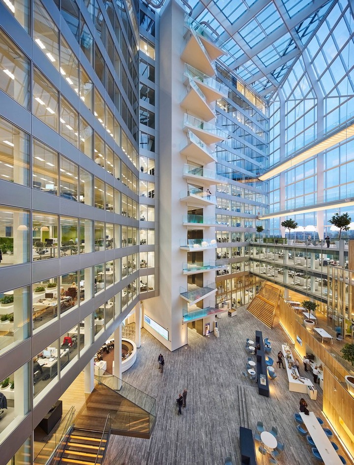 Often called the world’s smartest and greenest office building, The Edge by PLP Architecture uses an array of sensors and smart technology to create an ultra-efficient workspace. The building generates more energy than it consumes through solar panels covering the roof and south-facing facade. Its intelligent lighting system responds to individual preferences and occupancy, while the app-based system helps employees find available desks, meeting rooms, and even parking spaces. The building’s BREEAM score of 98.4% made it the most sustainable office building ever constructed at the time of completion.