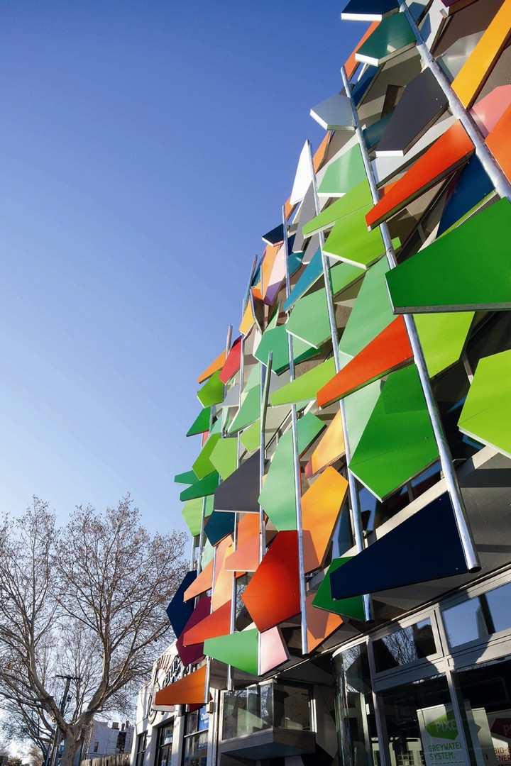 The Pixel Building lives up to its name as Australia’s first carbon-neutral office building. This colorful, pixelated facade isn’t just visually striking—it’s highly functional. The building features wind turbines, solar panels, a vacuum waste system, and water harvesting technology. The playful exterior design uses bright, varied colors on prefabricated panels, creating a dynamic appearance that changes with the viewing angle and lighting conditions. Studio505’s design proves that sustainability and visual appeal aren’t mutually exclusive.