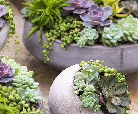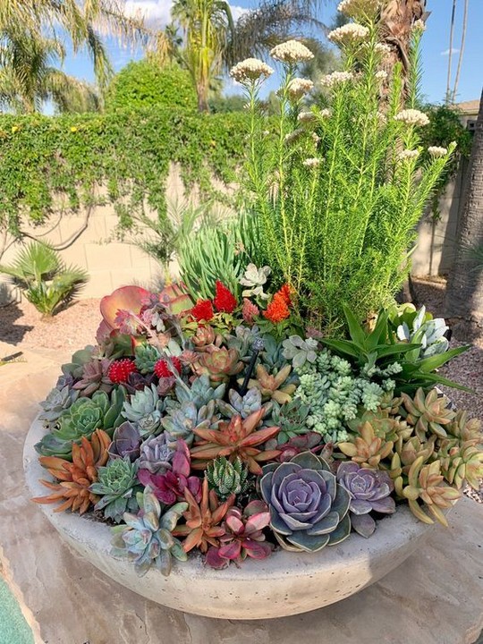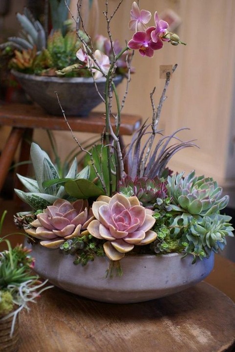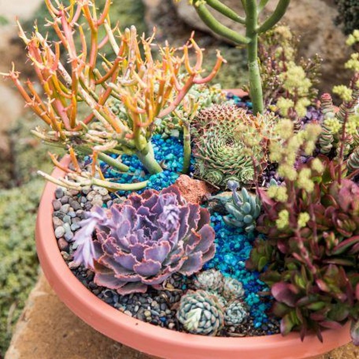 - Plant a variety of succulents in a large, shallow bowl or container.