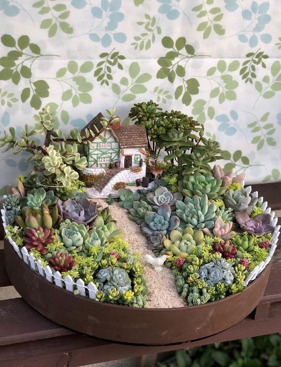 - Create a whimsical, miniature garden with succulents, miniature accessories, and tiny figurines.