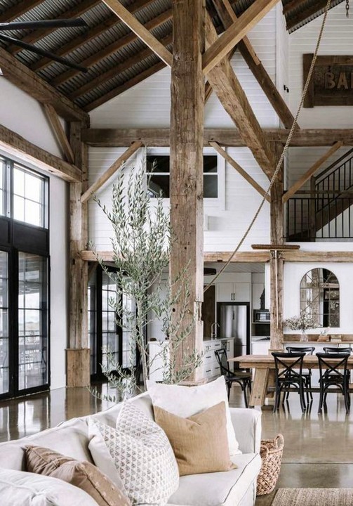 Highlight and retain the barn’s rustic charm by keeping exposed beams and structural elements visible. You can even consider refinishing them to give them a modern twist.