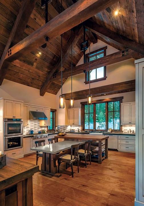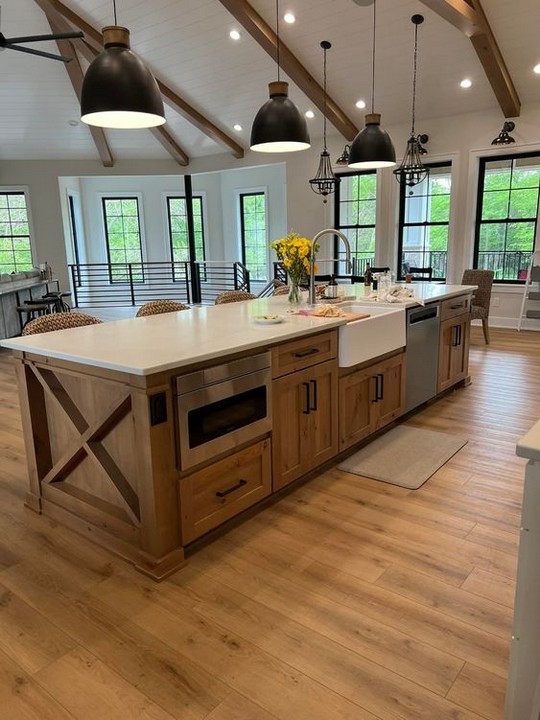 Design a modern and functional kitchen with sleek appliances, granite or quartz countertops, and a large island. Add rustic elements like a barn wood backsplash or open shelving.
