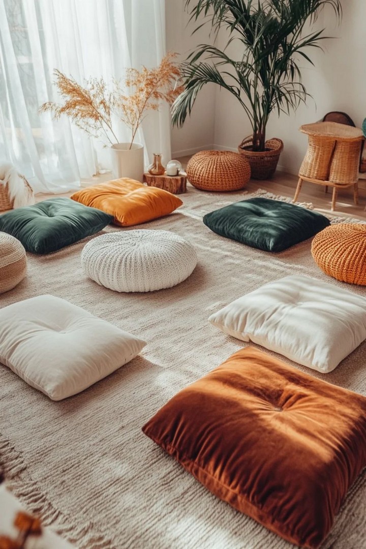 Expand your seating options beyond traditional furniture with floor cushions, poufs, and bean bags in luxurious materials. These pieces add flexibility to your space while maintaining the cozy, laid-back vibe you’re after. Floor seating works particularly well for small apartments where traditional furniture might feel overwhelming. It also encourages a more relaxed, informal lifestyle.