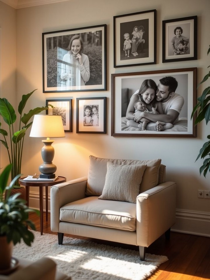 Transform blank walls into personal storytelling spaces with carefully curated gallery walls. Mix family photos, artwork, prints, and meaningful objects in matching or complementary frames. The key is creating a cohesive look while showcasing your personality. Start by laying out your arrangement on the floor before hanging anything on the wall. This allows you to experiment with different layouts and ensures proper spacing between pieces.
