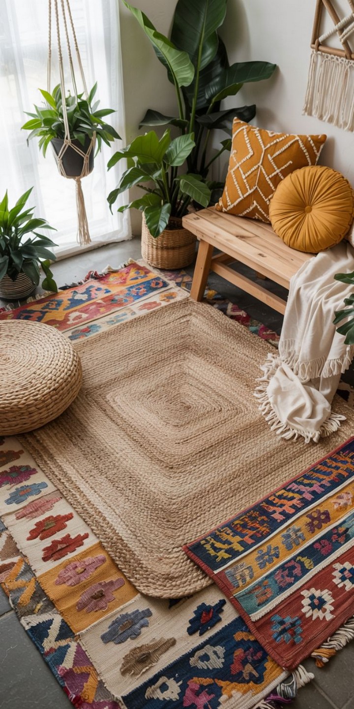 Don’t limit yourself to one rug per room. Layering rugs adds depth, defines spaces, and provides extra warmth, especially important in apartments with hard flooring. Try layering a smaller patterned rug over a larger neutral one, or combine different textures like jute and wool. In studio apartments, rugs can help define different areas, a dining area, sleeping area, or living space, without physical walls.