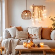 Nothing says cozy like an abundance of soft, touchable textures. Layer different materials to create visual and tactile interest: chunky knit throw blankets, velvet cushions, faux fur rugs, linen curtains, and wool pillows. The key is mixing textures while maintaining a cohesive color story. A well-placed chunky knit blanket draped over a sofa or armchair instantly makes the space more inviting. Add a faux sheepskin rug under a coffee table or beside your bed for an extra touch of luxury and warmth.