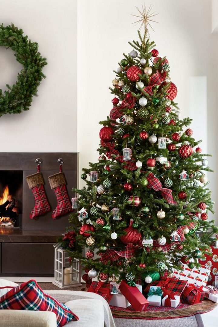 - Decorate the tree with red and green ornaments, lights, and a tree topper.