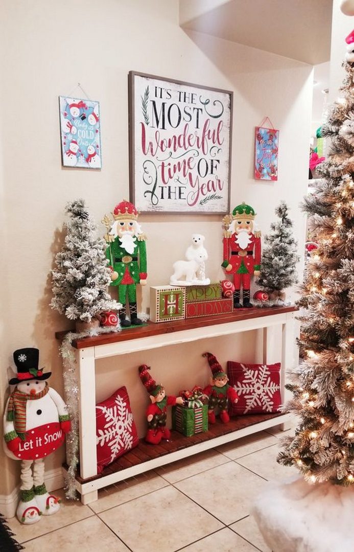Display classic red and green nutcrackers and other Christmas figurines on shelves or side tables.
